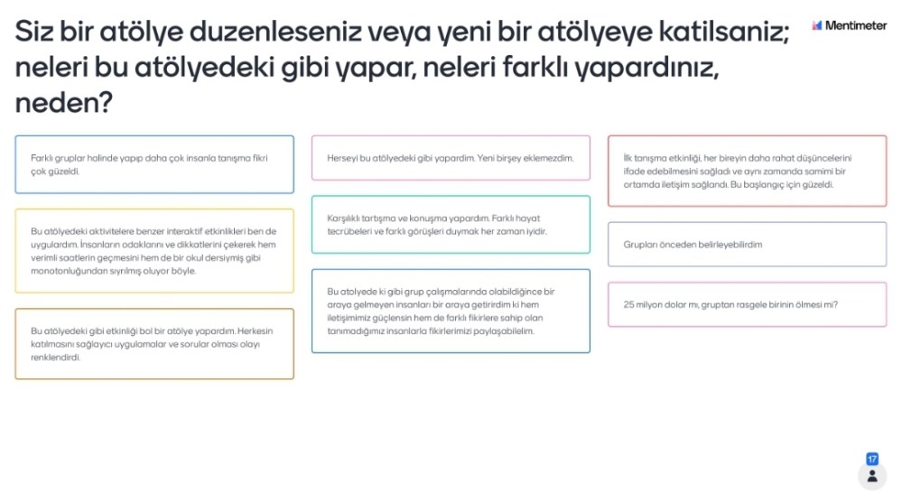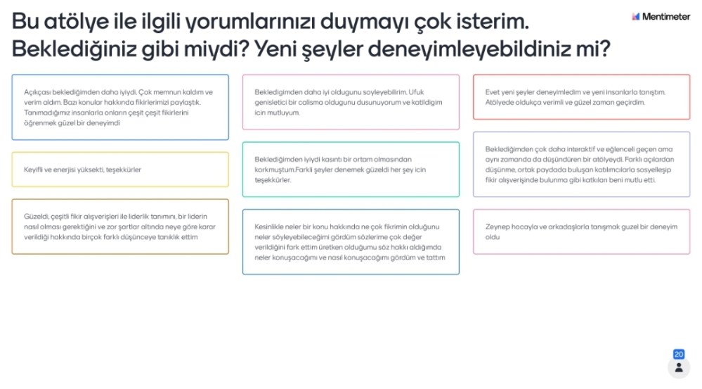 Bu atölyeyi bir kelime ile ifade etseniz ne dersiniz sorusuna verdiğiniz cevaplar için çok teşekkür ediyorum.
